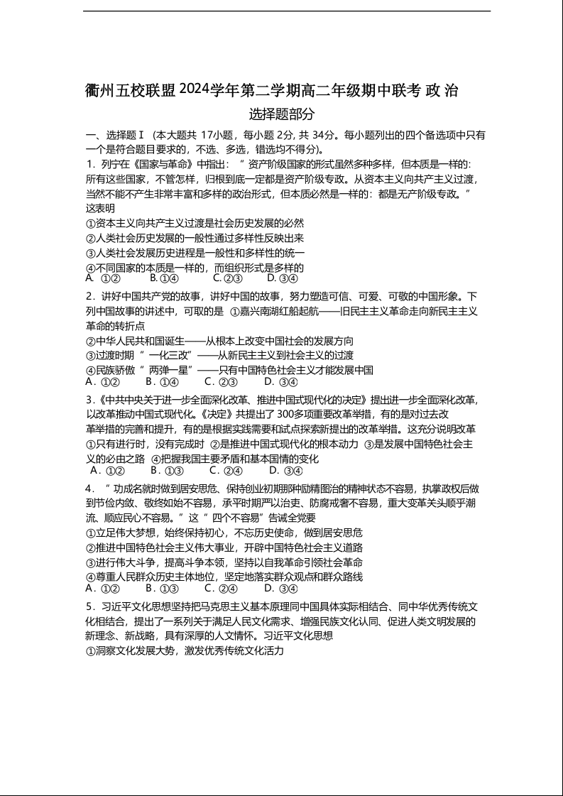 浙江省衢州市五校联盟2024-2025学年下学期高二期中联考政治