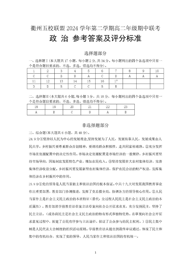 浙江省衢州市五校联盟2024-2025学年下学期高二期中联考政治答案