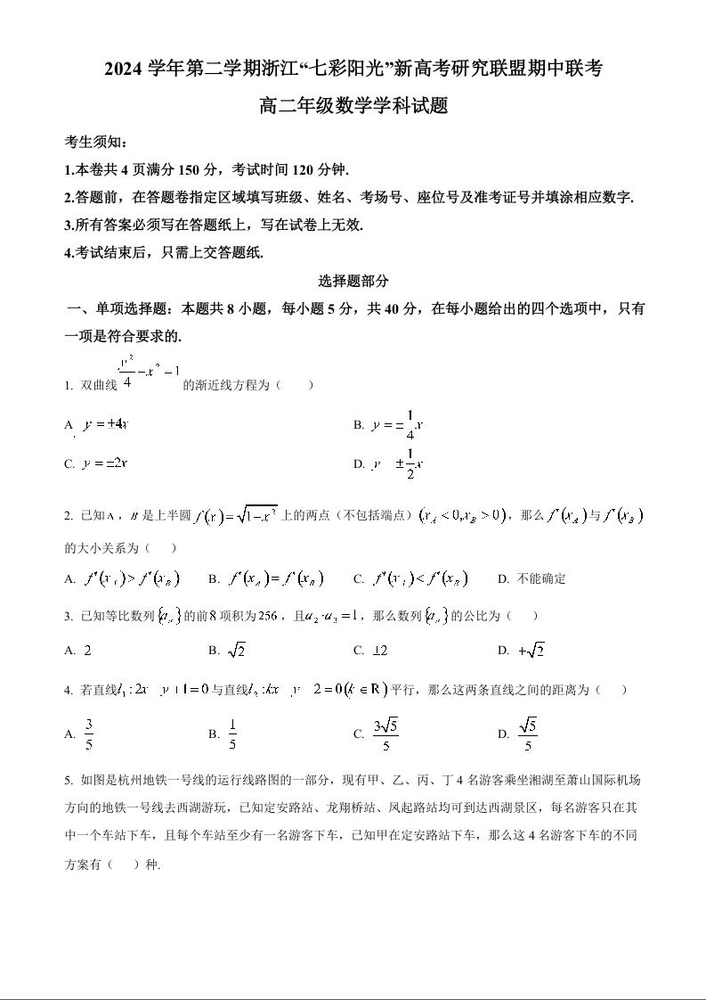 浙江省七彩阳光联盟2024-2025学年下学期高二期中联考数学+答案