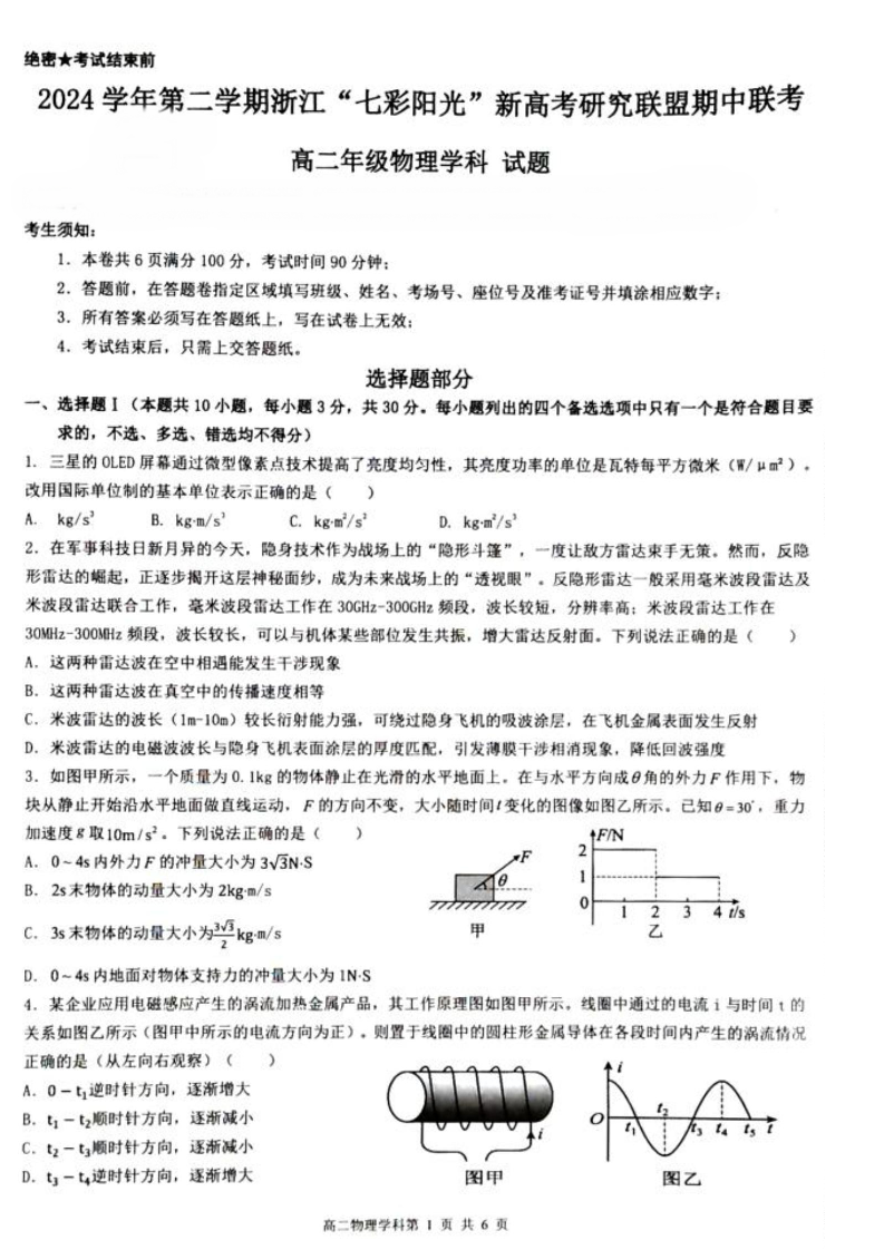 浙江省七彩阳光联盟2024-2025学年下学期高二期中联考物理