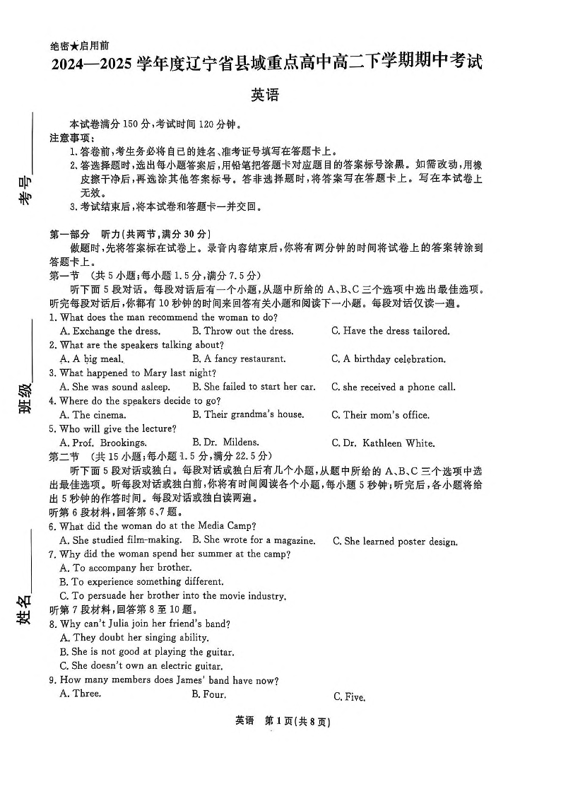 辽宁省县域重点高中2024-2025学年下学期高二期中考试英语+答案