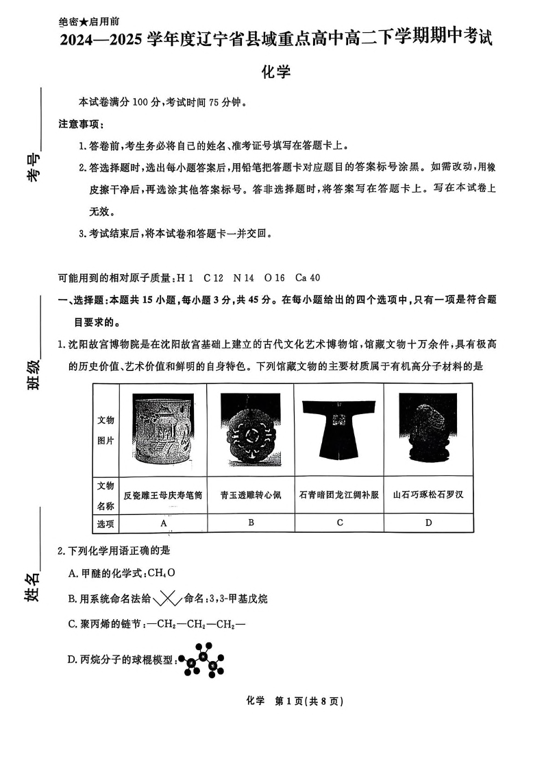辽宁省县域重点高中2024-2025学年下学期高二期中考试化学+答案