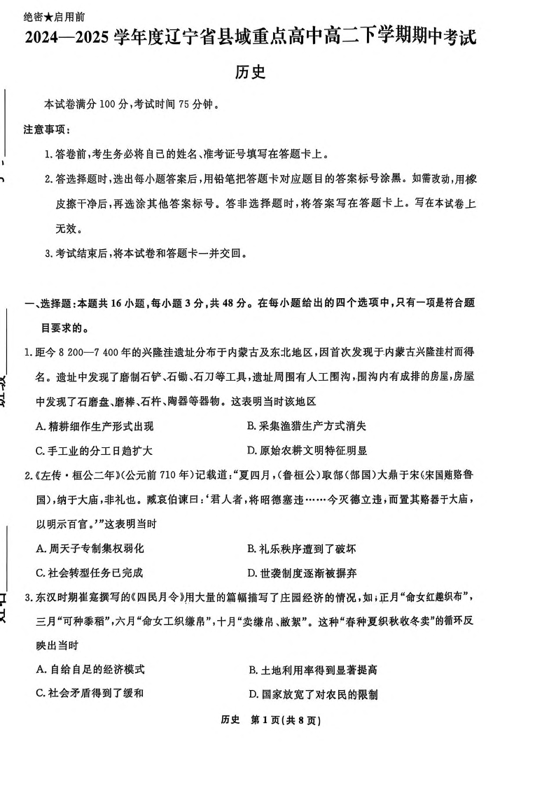 辽宁省县域重点高中2024-2025学年下学期高二期中考试历史+答案