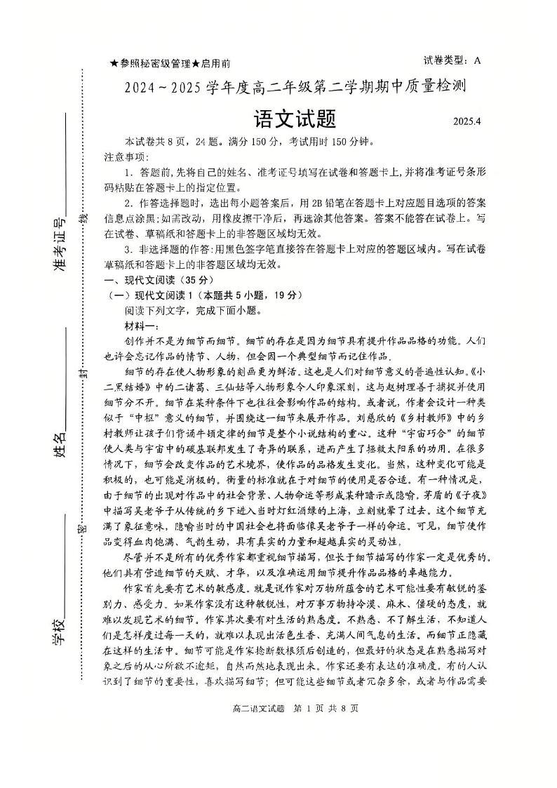 山东省枣庄市2024-2025学年下学期4月高二期中考试语文+答案