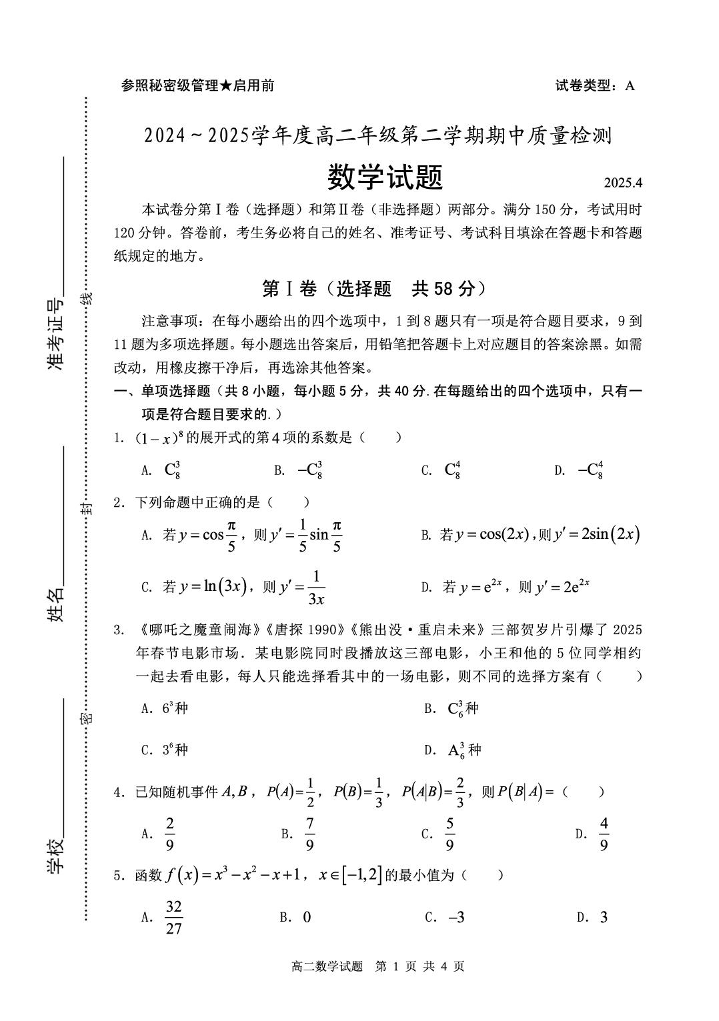 山东省枣庄市2024-2025学年下学期4月高二期中考试数学+答案