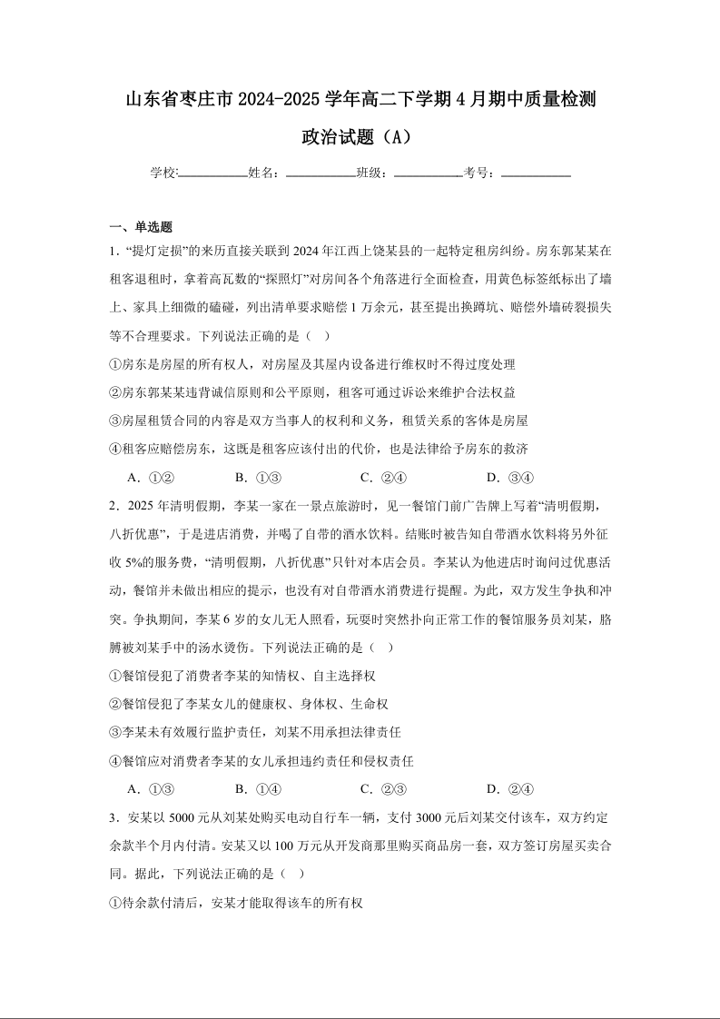 山东省枣庄市2024-2025学年下学期4月高二期中考试政治+答案