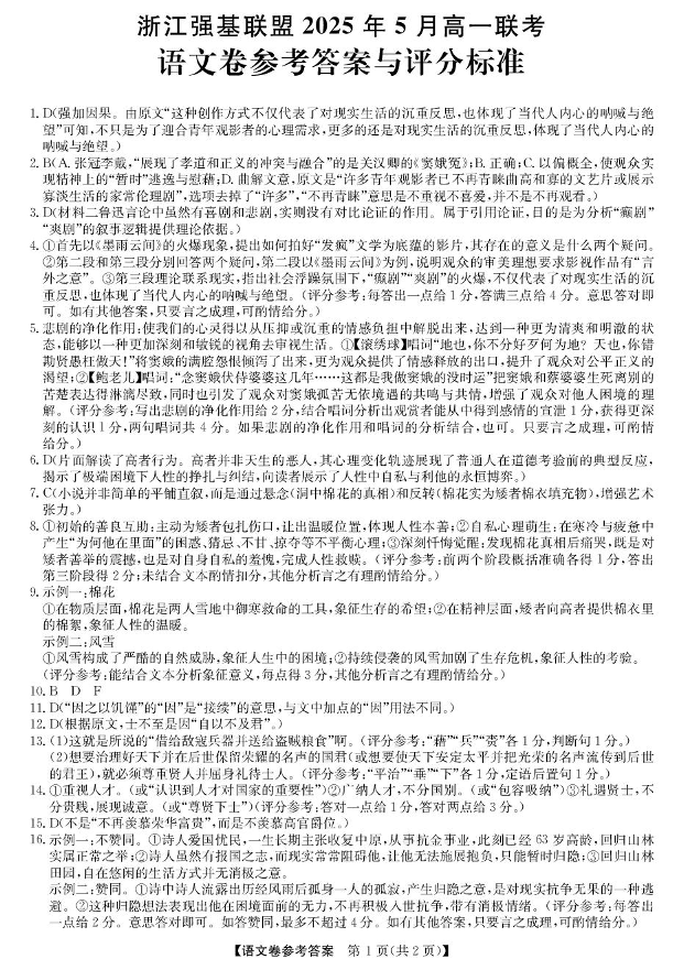 浙江省强基联盟2024-2025学年下学期5月高一月考语文答案