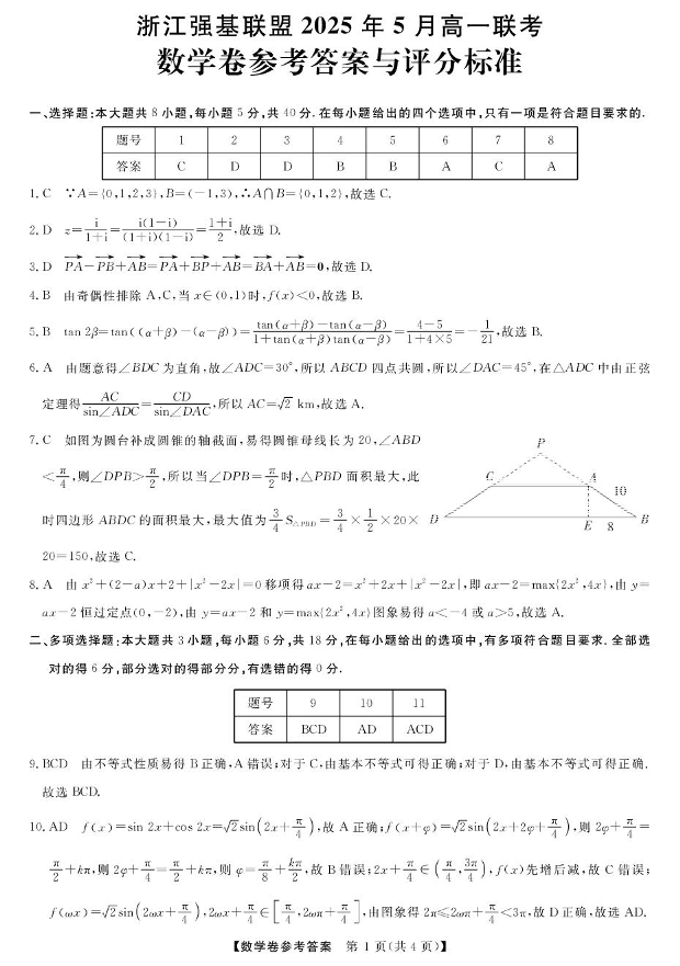 浙江省强基联盟2024-2025学年下学期5月高一月考数学答案