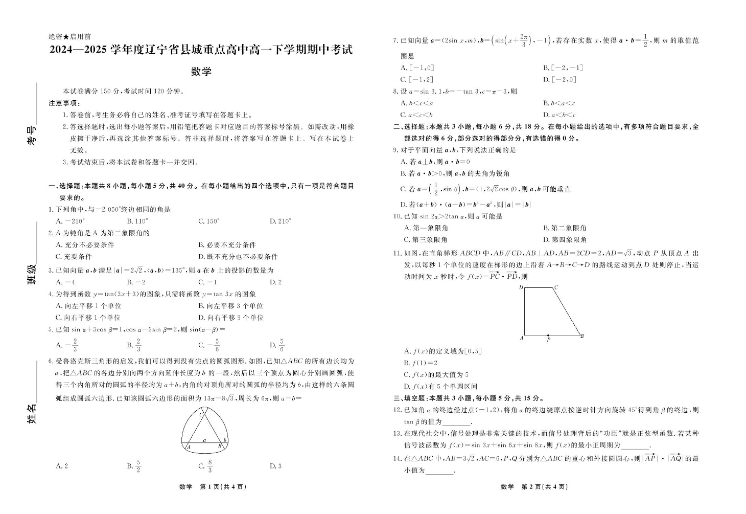 辽宁省县域重点高中2024-2025学年下学期高一期中考试数学+答案