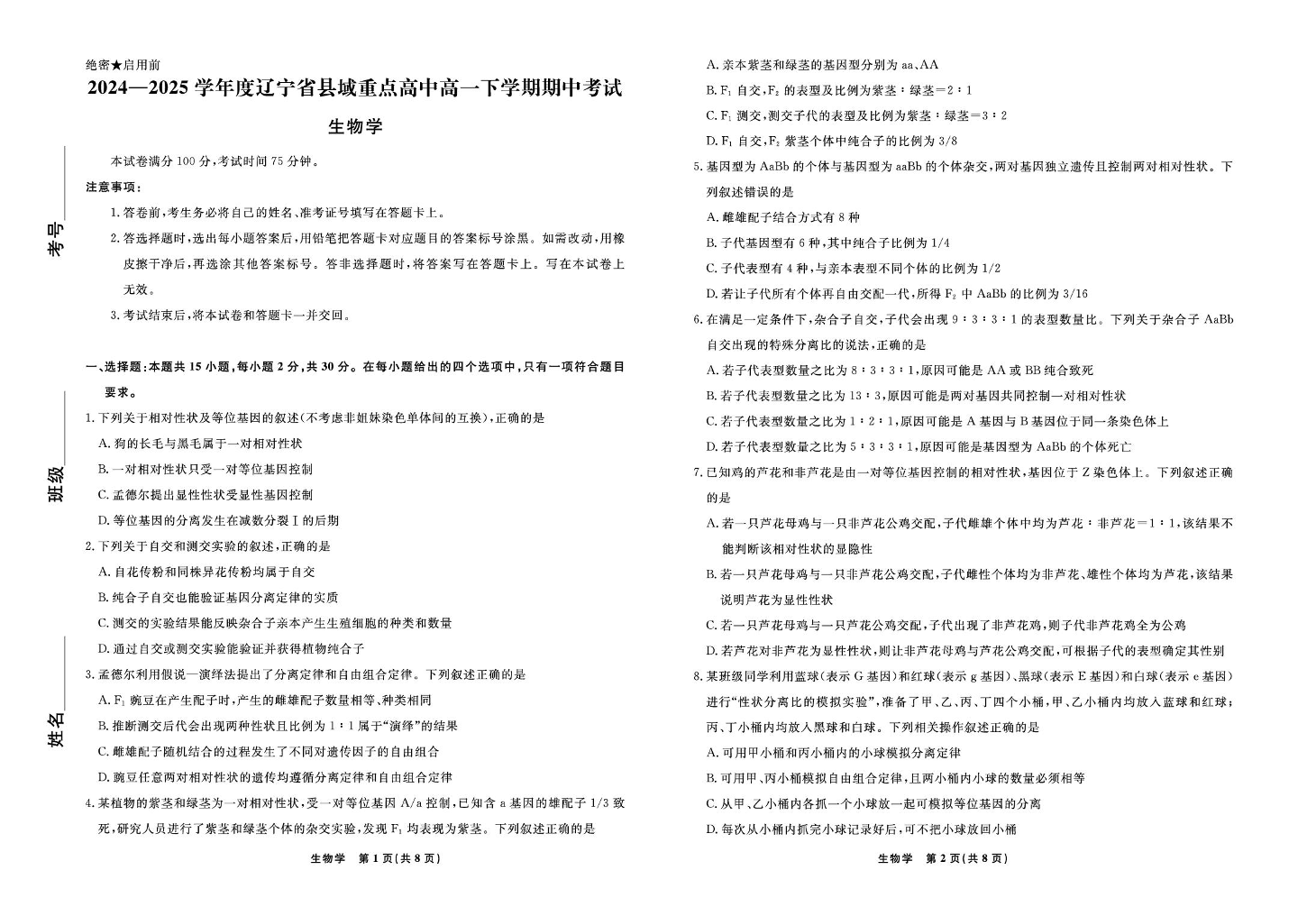 辽宁省县域重点高中2024-2025学年下学期高一期中考试生物+答案