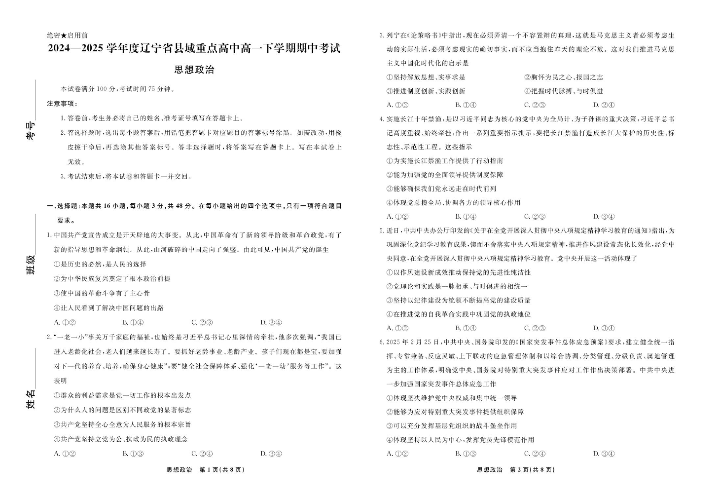 辽宁省县域重点高中2024-2025学年下学期高一期中考试政治+答案