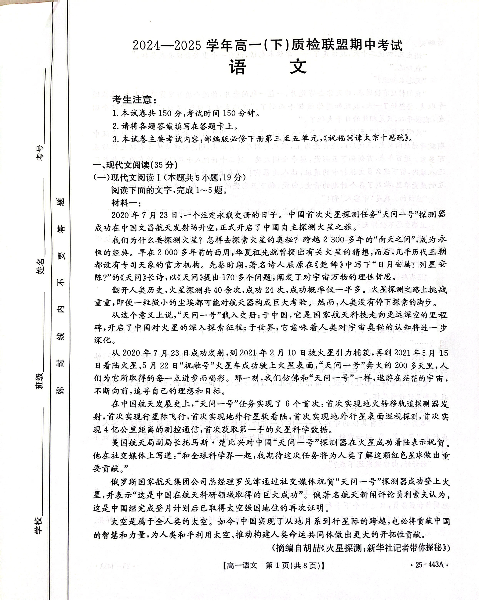 河北省邢台市质检联盟2024-2025学年下学期高一期中考试语文+答案