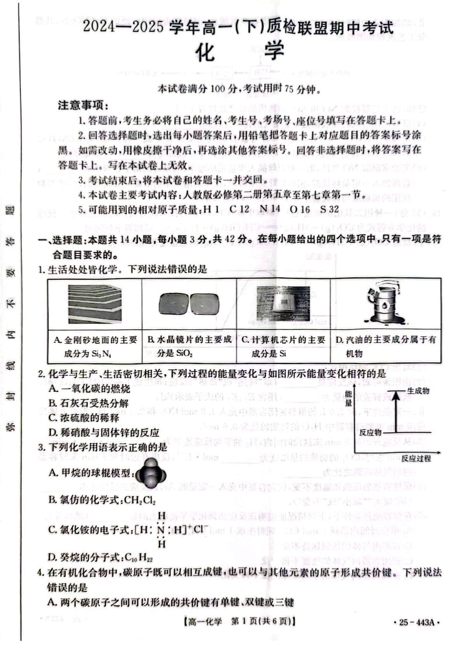 河北省邢台市质检联盟2024-2025学年下学期高一期中考试化学+答案