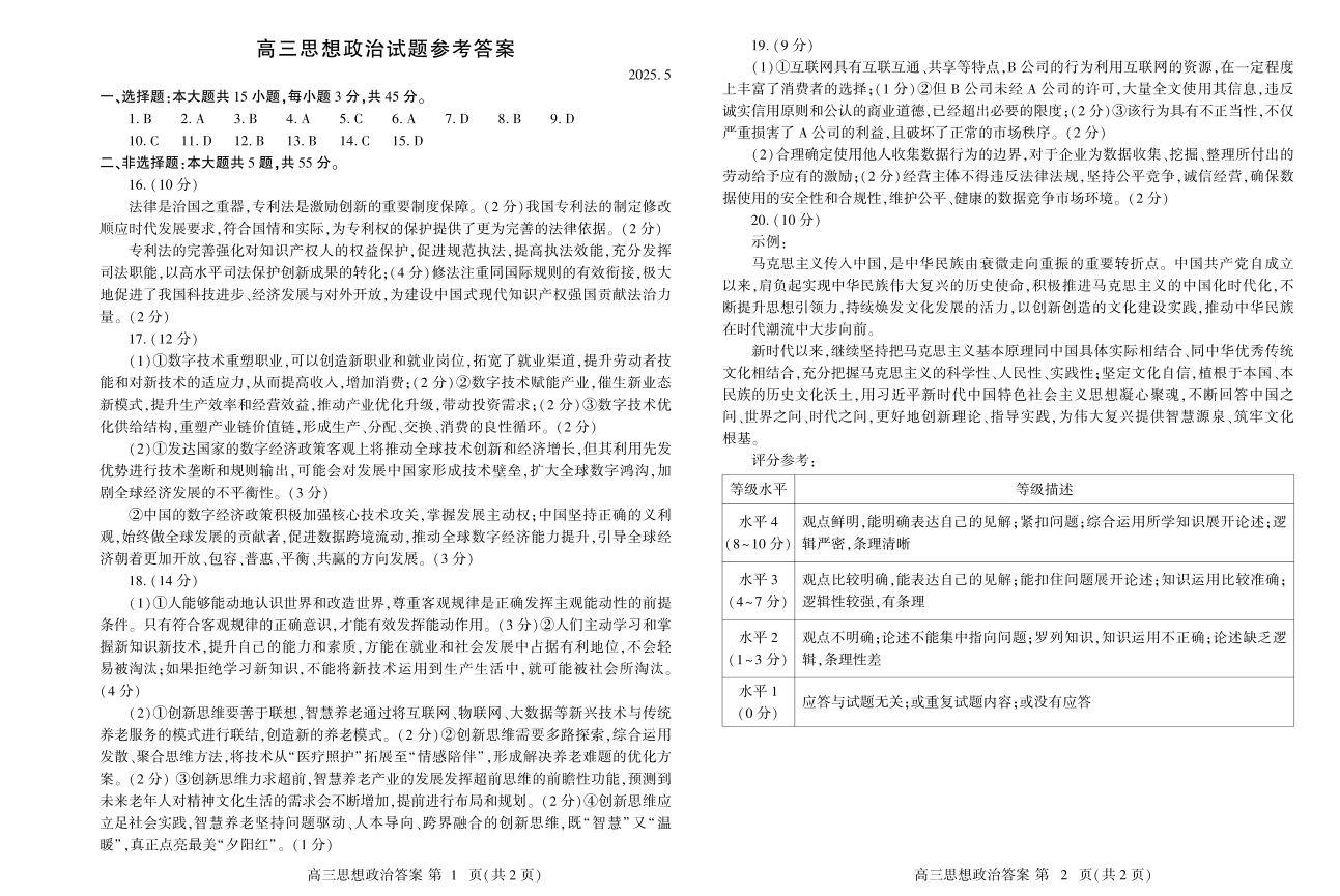 山东省潍坊市2024-2025学年下学期5月高三三模考试政治答案