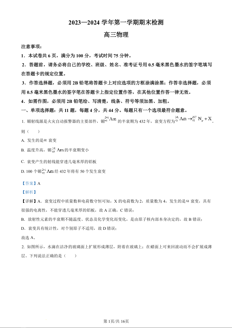 江苏省扬州市2024届高三上学期1月期末考试物理(精品解析版)