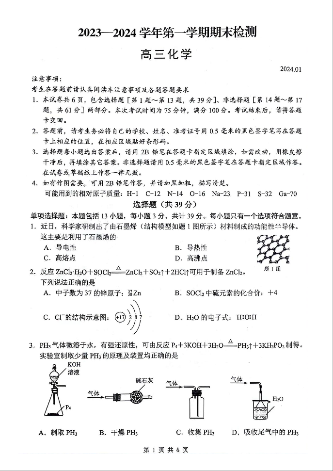 江苏省扬州市2024届高三上学期1月期末考试化学+答案