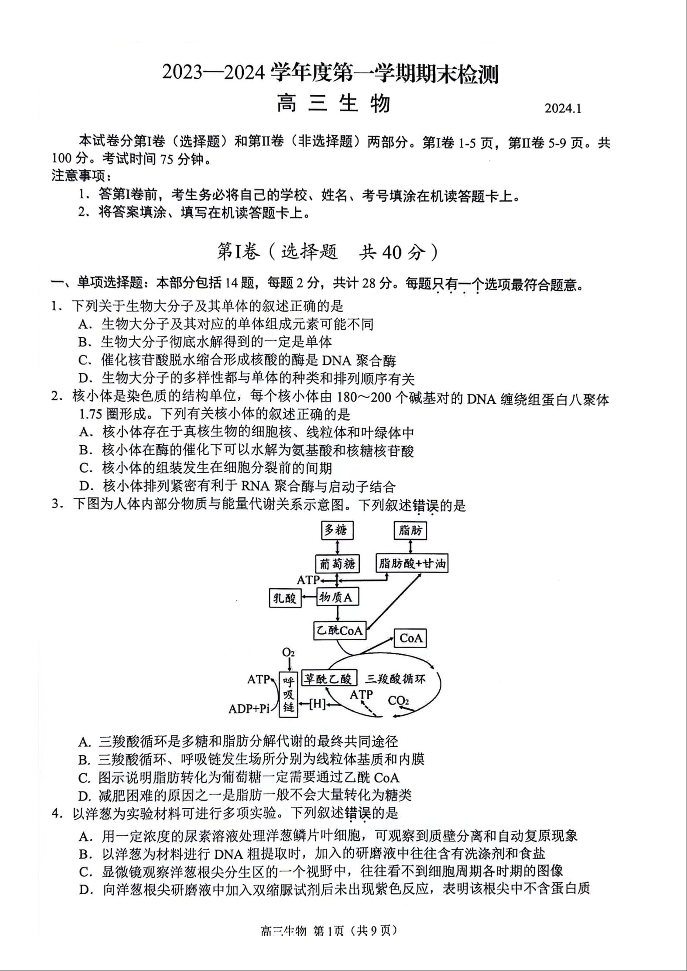 江苏省扬州市2024届高三上学期1月期末考试生物