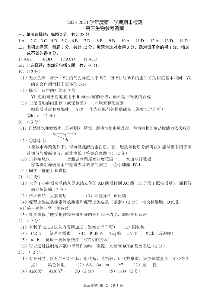 江苏省扬州市2024届高三上学期1月期末考试生物答案
