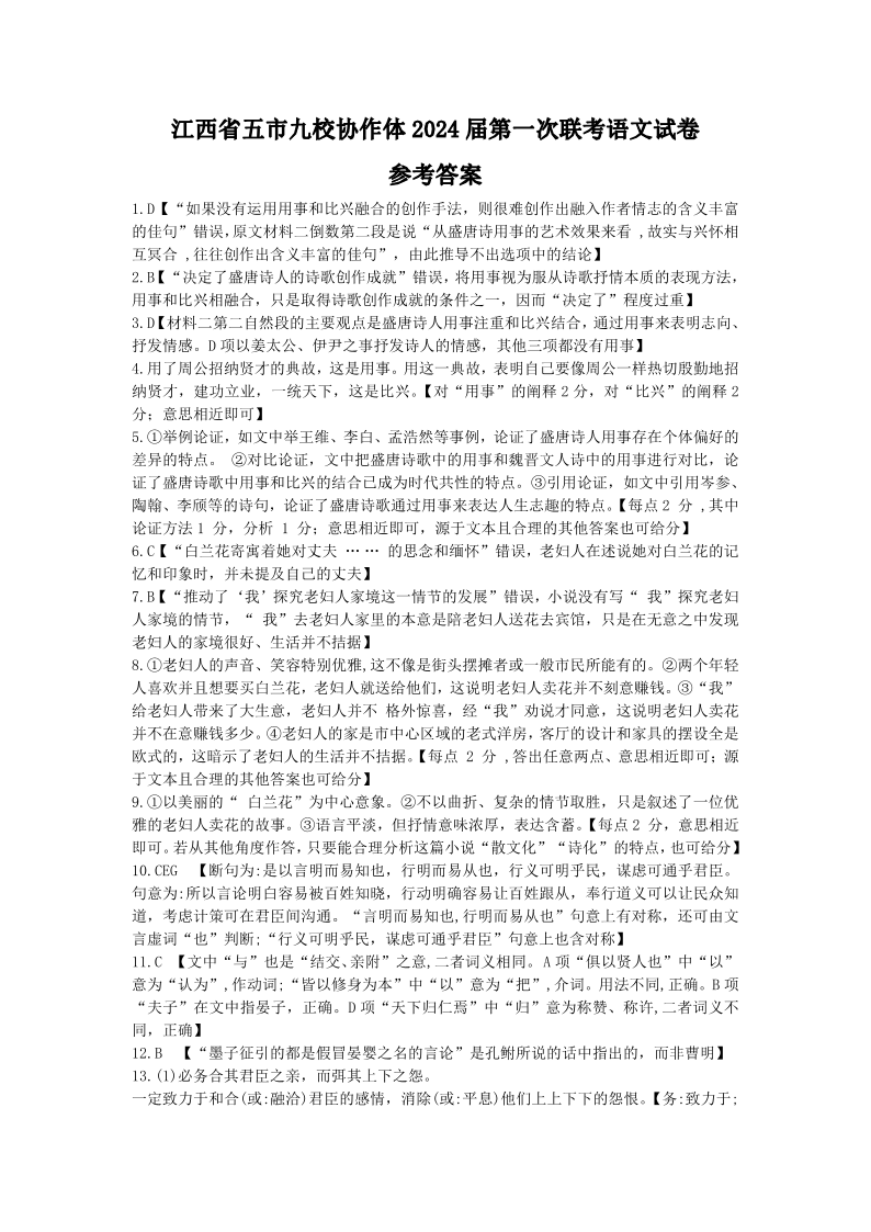江西省五市九校协作体2024届高三上学期第一次联考语文答案