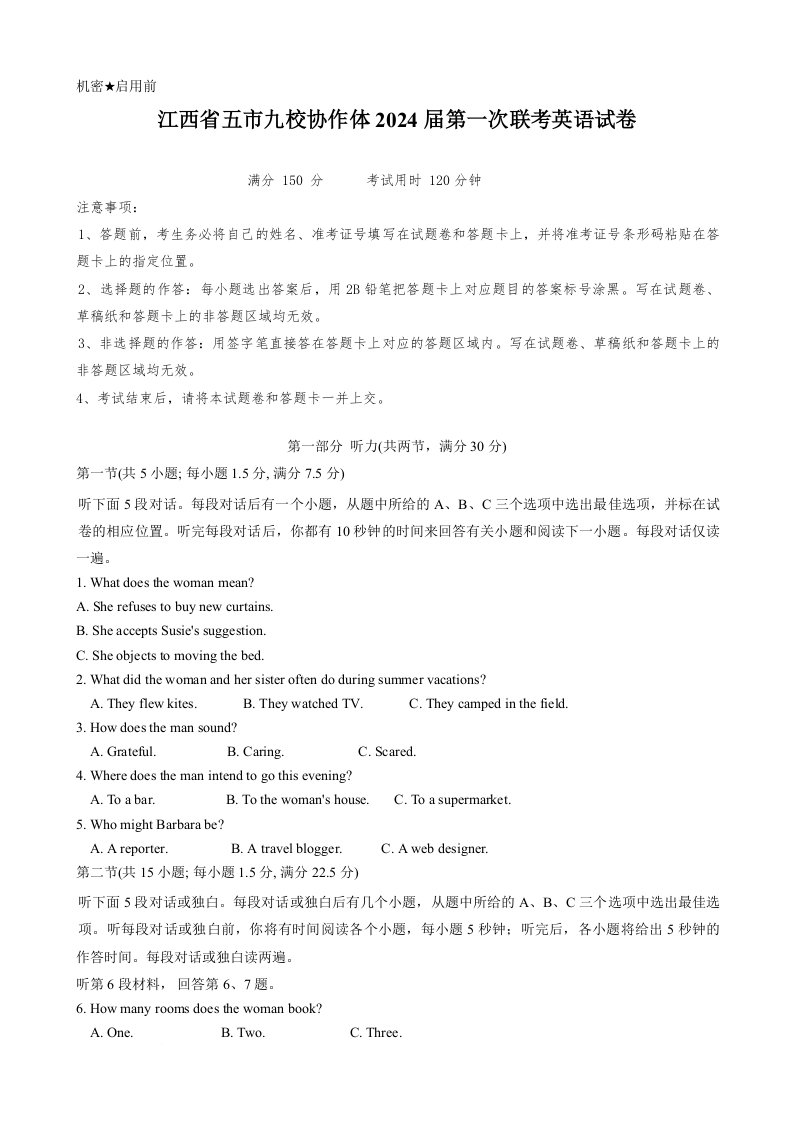 江西省五市九校协作体2024届高三上学期第一次联考英语