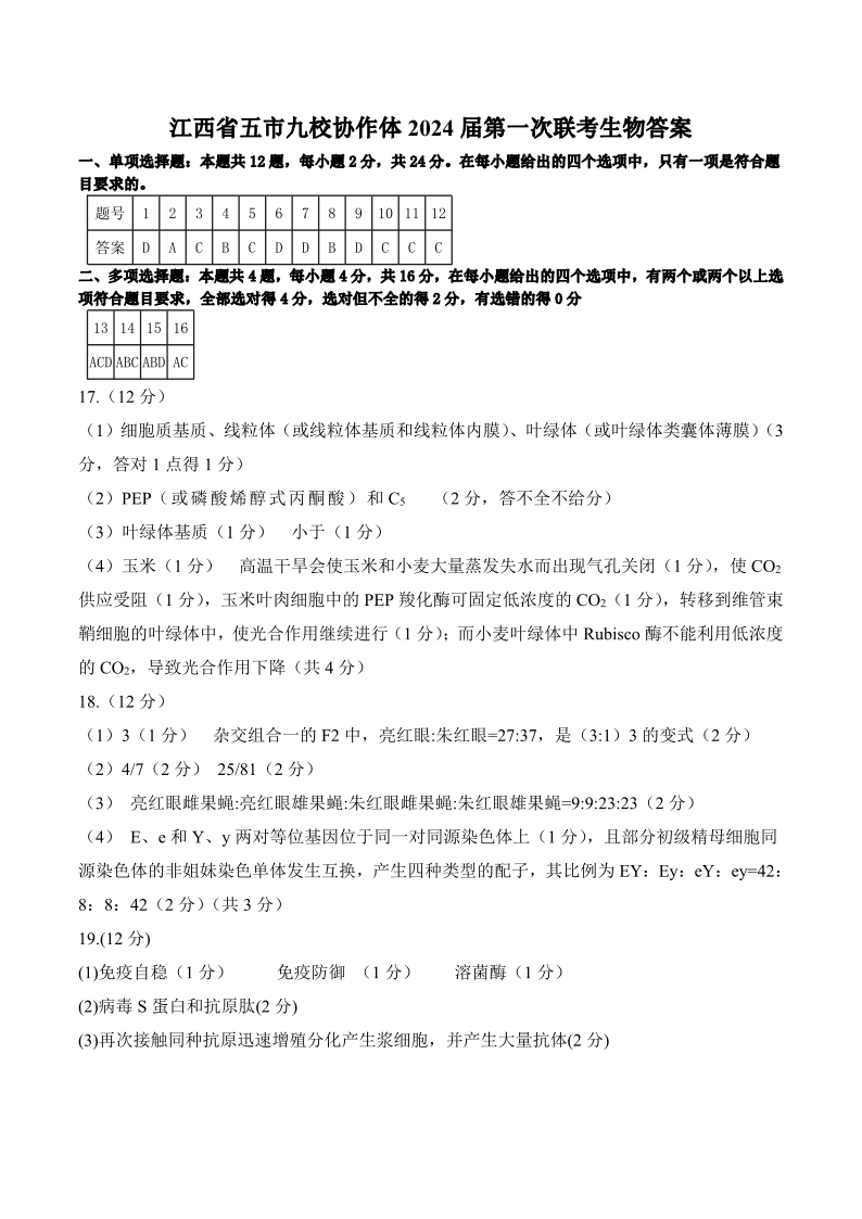 江西省五市九校协作体2024届高三上学期第一次联考生物答案