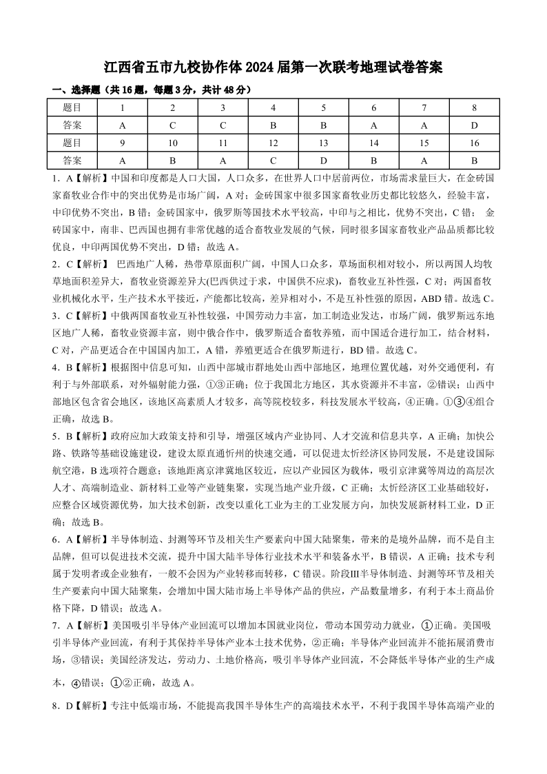 江西省五市九校协作体2024届高三上学期第一次联考地理答案