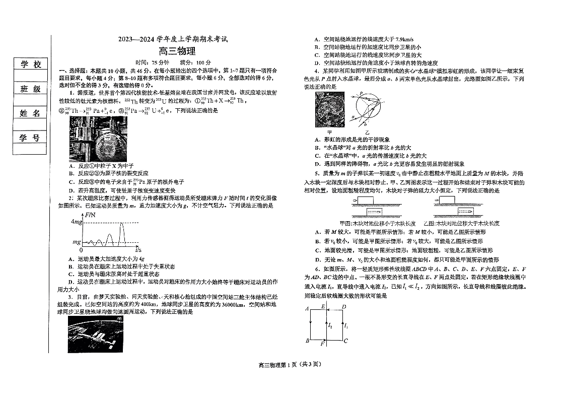 辽宁省鞍山市普通高中2024届高三上学期期末联考物理