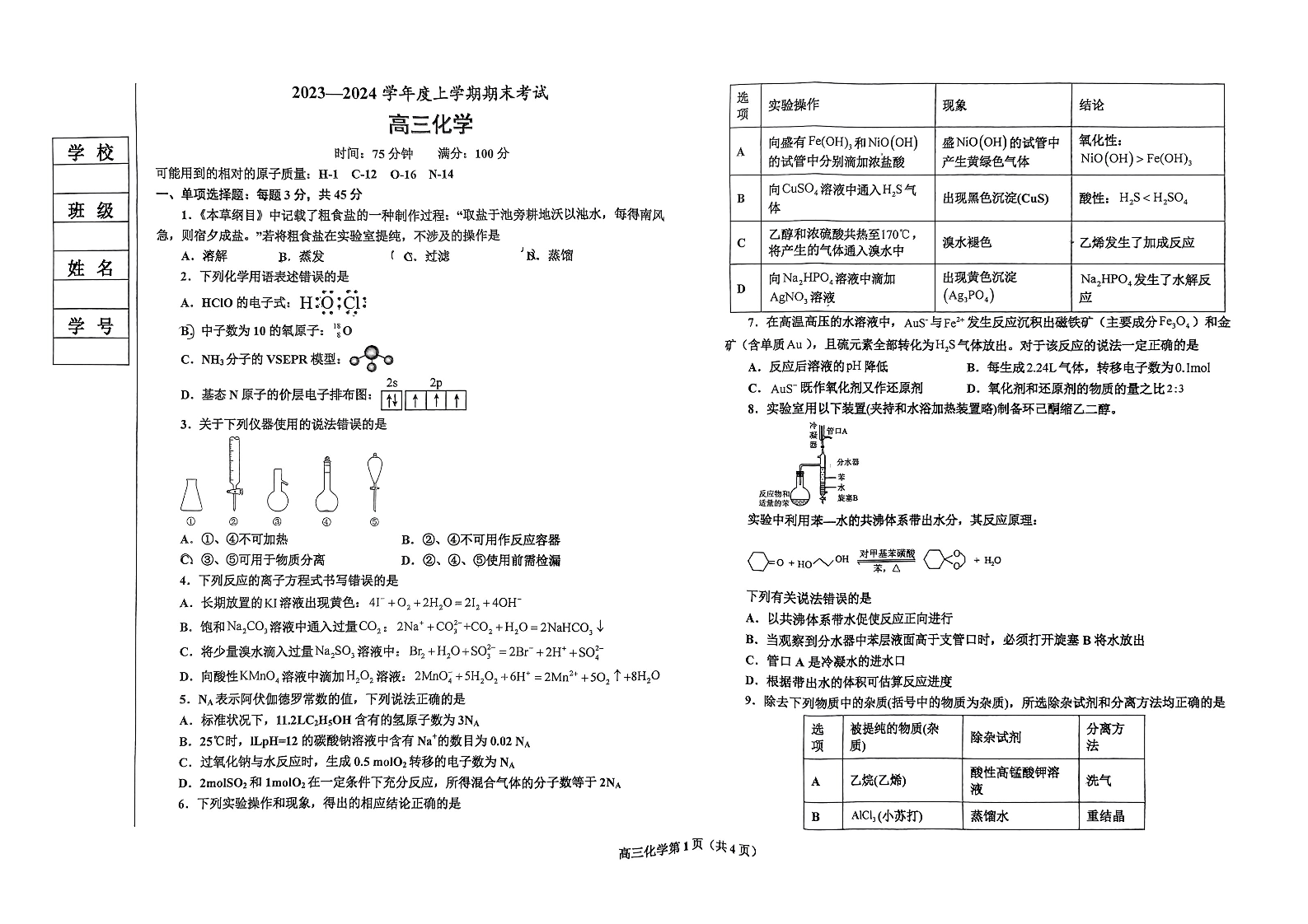 辽宁省鞍山市普通高中2024届高三上学期期末联考化学