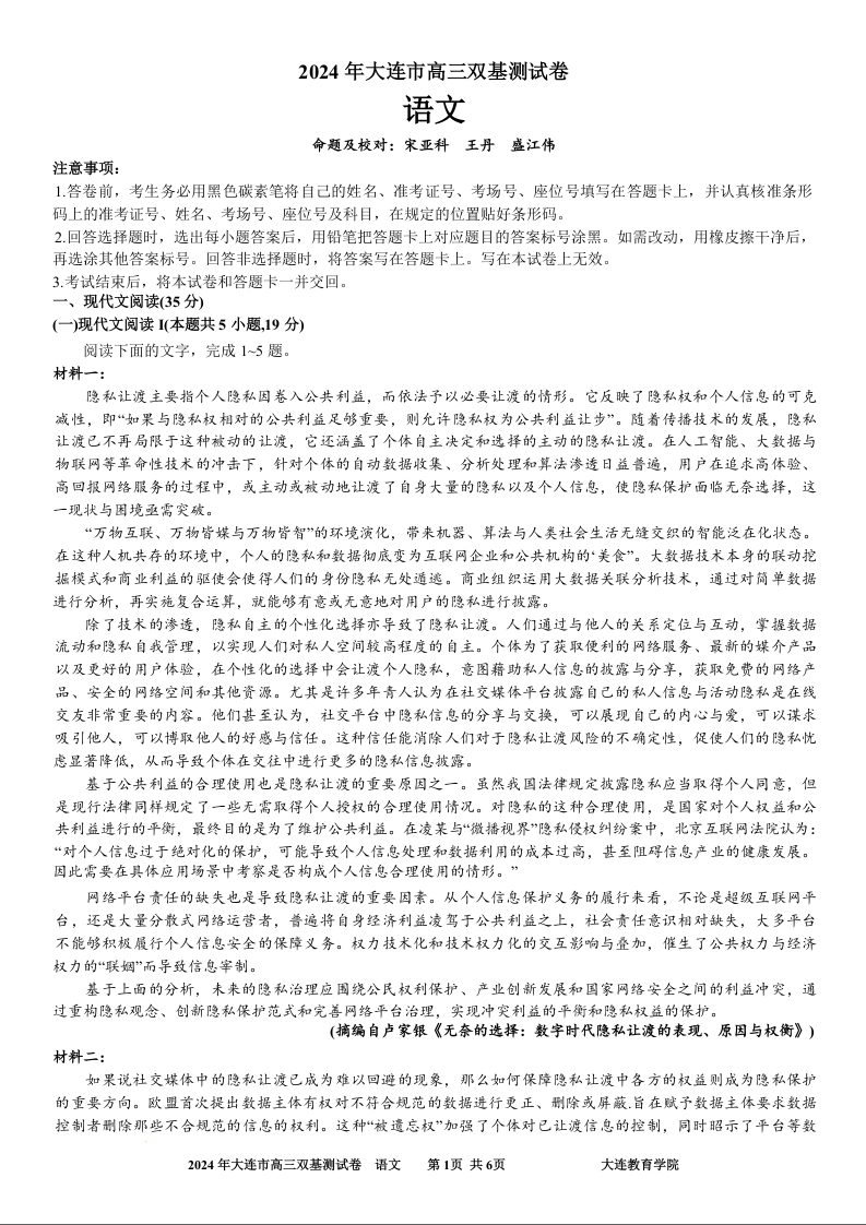 辽宁省大连市2024届高三上学期期末双基测试语文