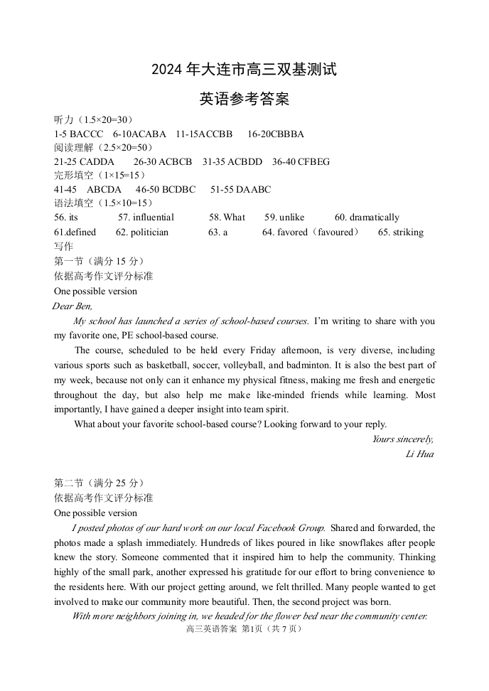 辽宁省大连市2024届高三上学期期末双基测试英语答案