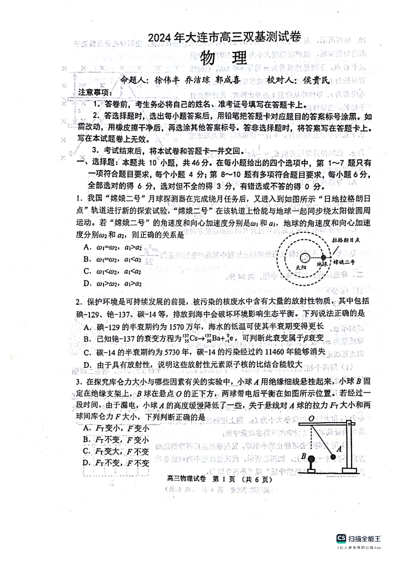 辽宁省大连市2024届高三上学期期末双基测试物理