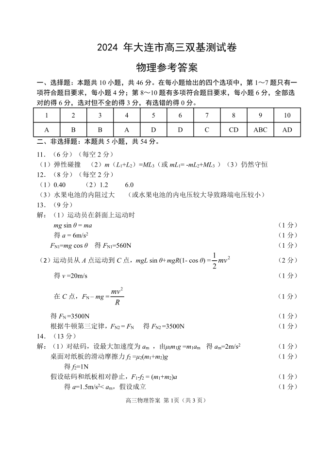 辽宁省大连市2024届高三上学期期末双基测试物理答案