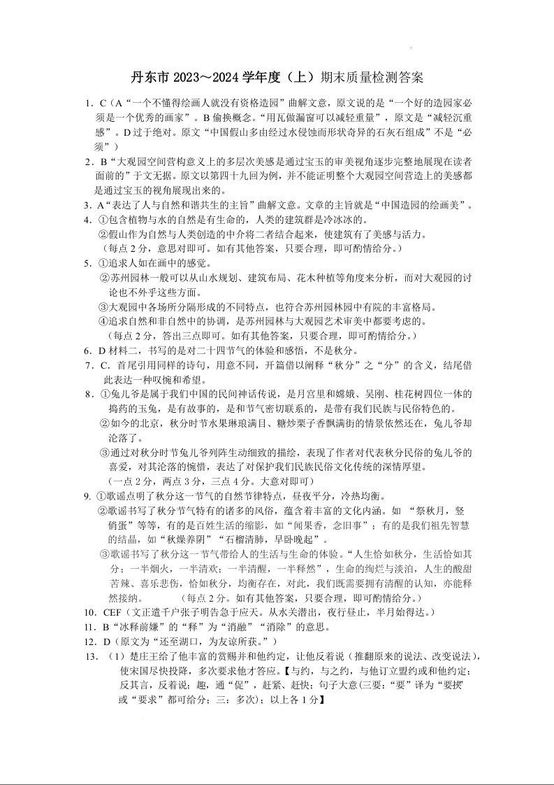 辽宁省丹东市2024届高三上学期期末教学质量监测语文答案