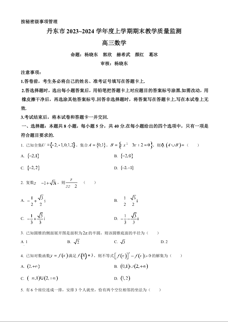 辽宁省丹东市2024届高三上学期期末教学质量监测数学