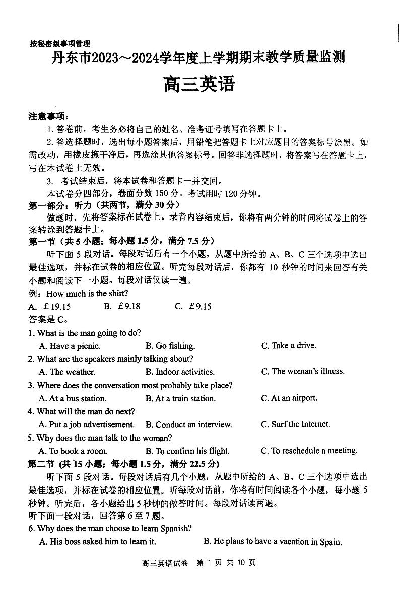 辽宁省丹东市2024届高三上学期期末教学质量监测英语