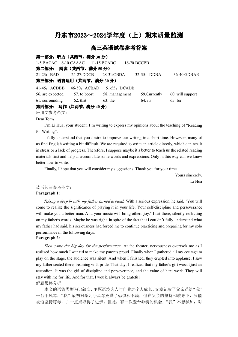 辽宁省丹东市2024届高三上学期期末教学质量监测英语答案