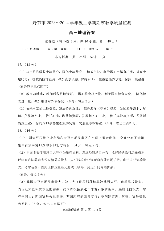 辽宁省丹东市2024届高三上学期期末教学质量监测地理答案