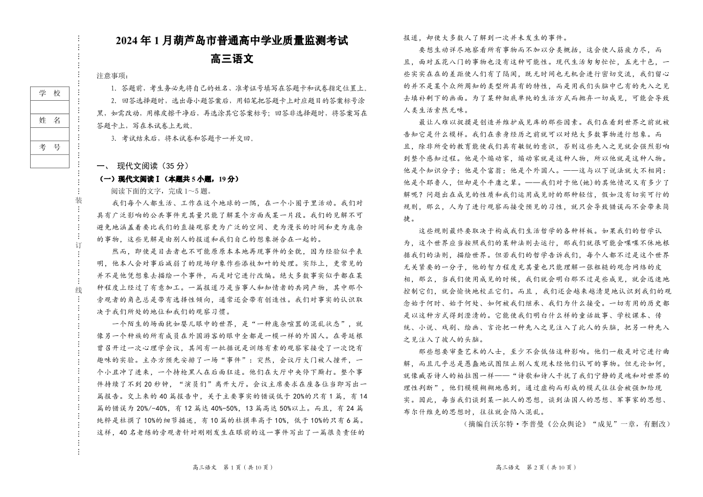辽宁省葫芦岛市2024届高三上学期期末学业质量监测语文