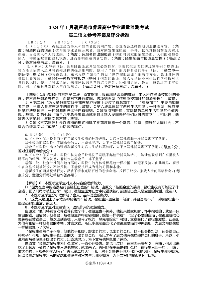 辽宁省葫芦岛市2024届高三上学期期末学业质量监测语文答案