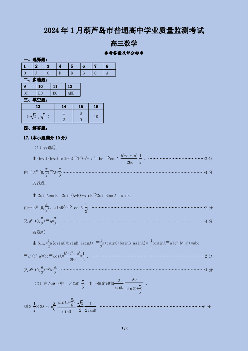 辽宁省葫芦岛市2024届高三上学期期末学业质量监测数学答案