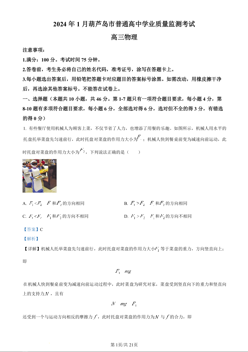 辽宁省葫芦岛市2024届高三上学期期末学业质量监测物理(精品解析版)