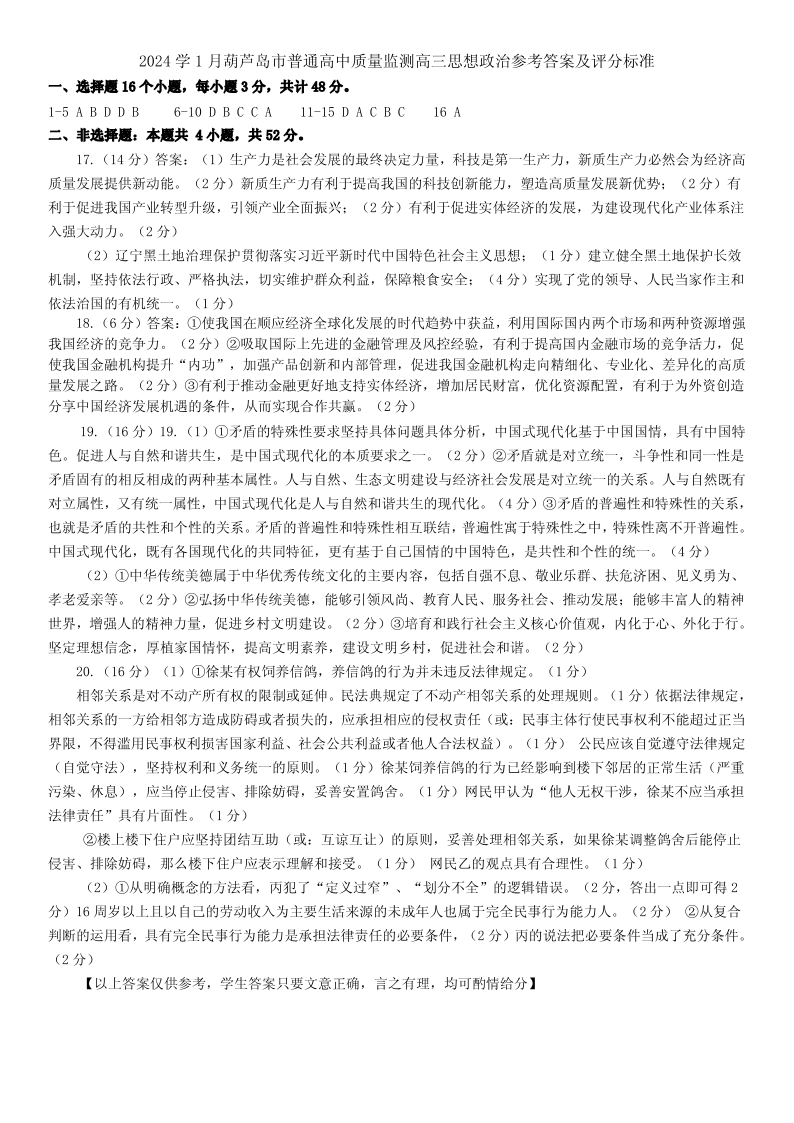 辽宁省葫芦岛市2024届高三上学期期末学业质量监测政治答案