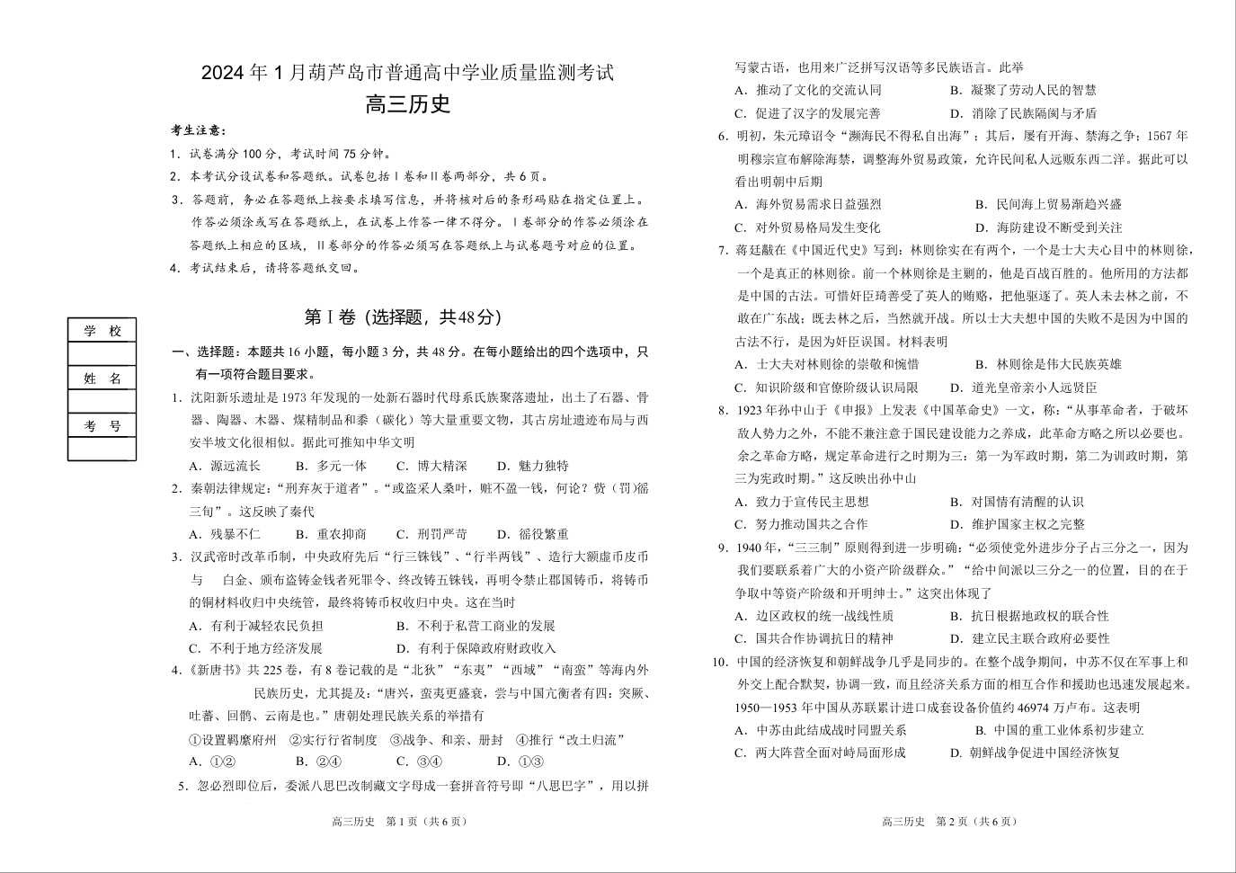 辽宁省葫芦岛市2024届高三上学期期末学业质量监测历史