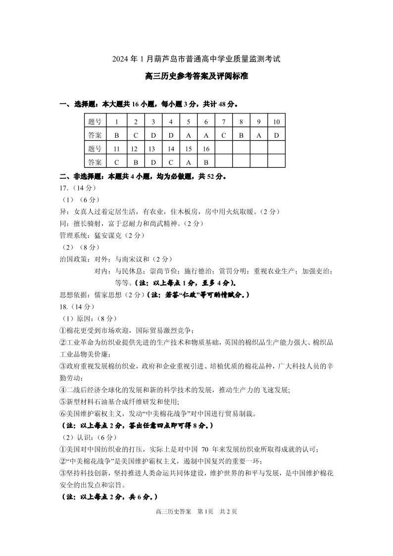 辽宁省葫芦岛市2024届高三上学期期末学业质量监测历史答案