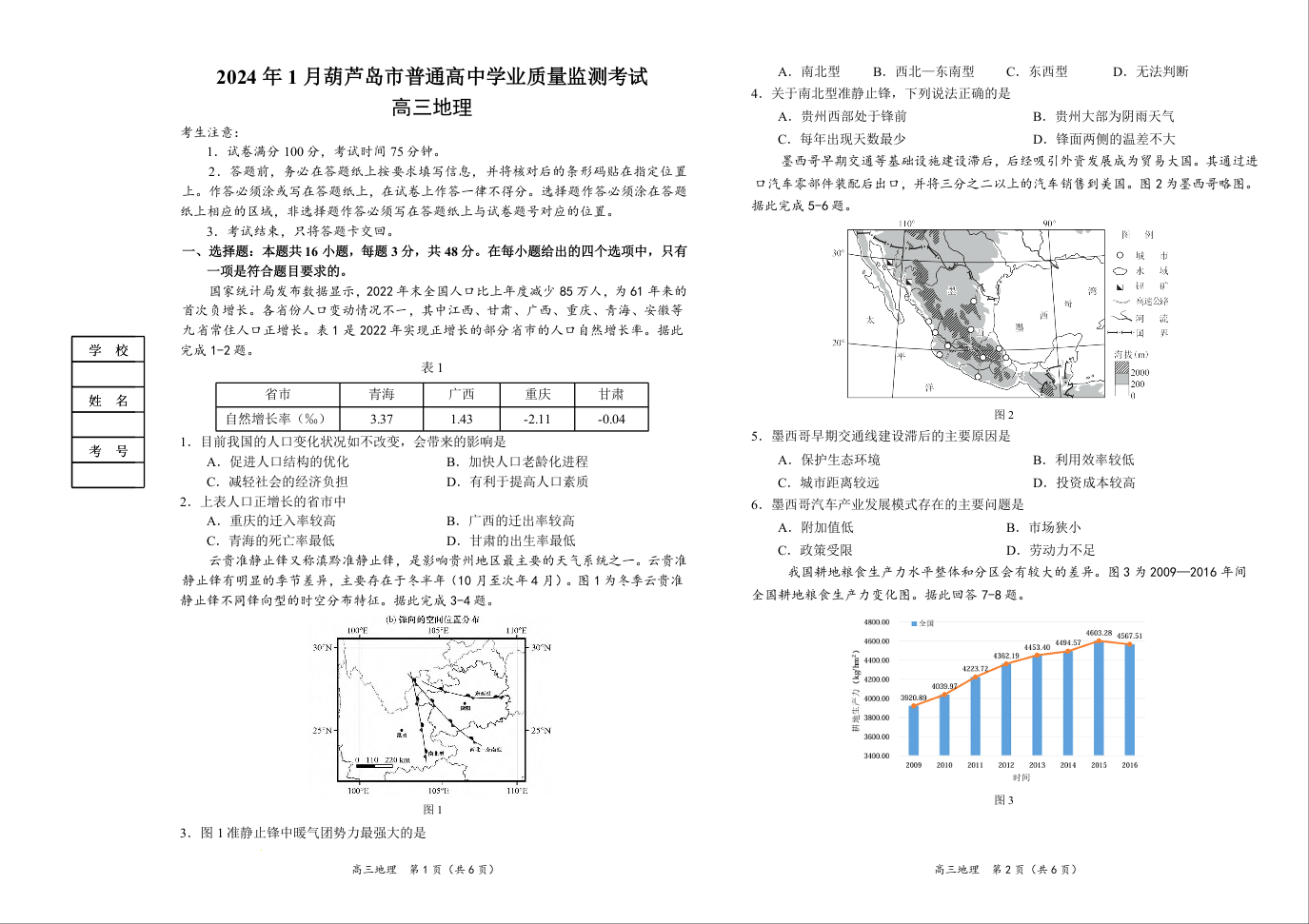 辽宁省葫芦岛市2024届高三上学期期末学业质量监测地理