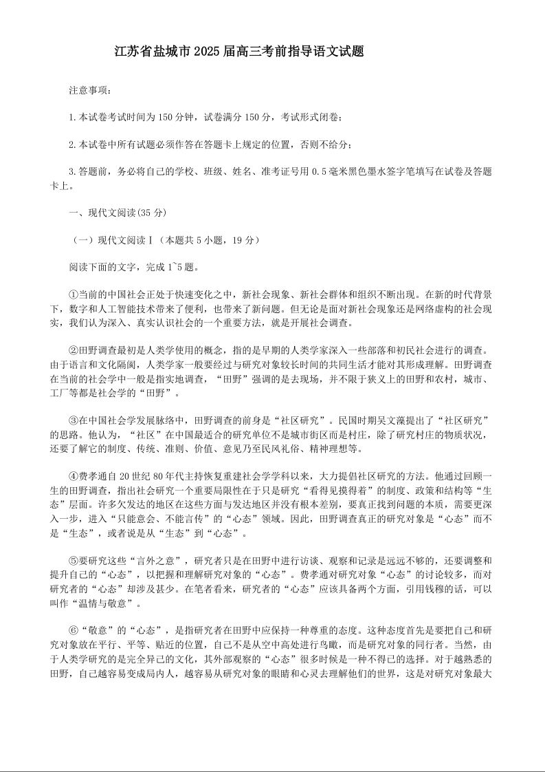 江苏省盐城市2025届高三考前指导卷(押题)语文+答案