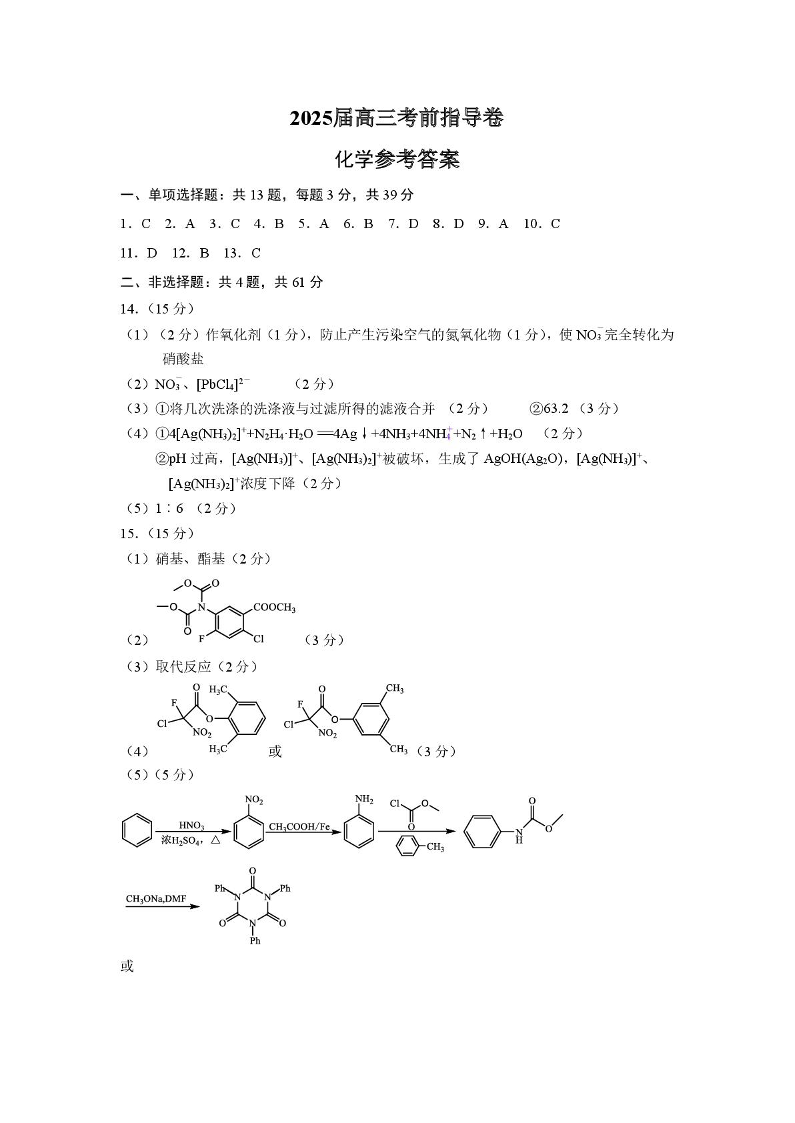江苏省盐城市2025届高三考前指导卷(押题)化学答案