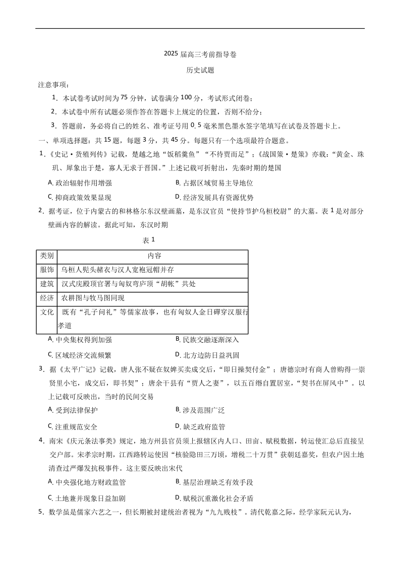 江苏省盐城市2025届高三考前指导卷(押题)历史+答案