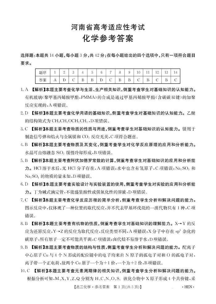 河南省创新发展2025届下学期5月高三高考适应性考试化学答案
