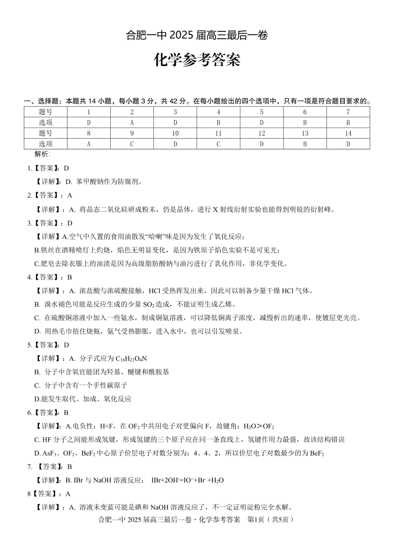 安徽省合肥市一中2025届高三下学期最后一卷化学答案